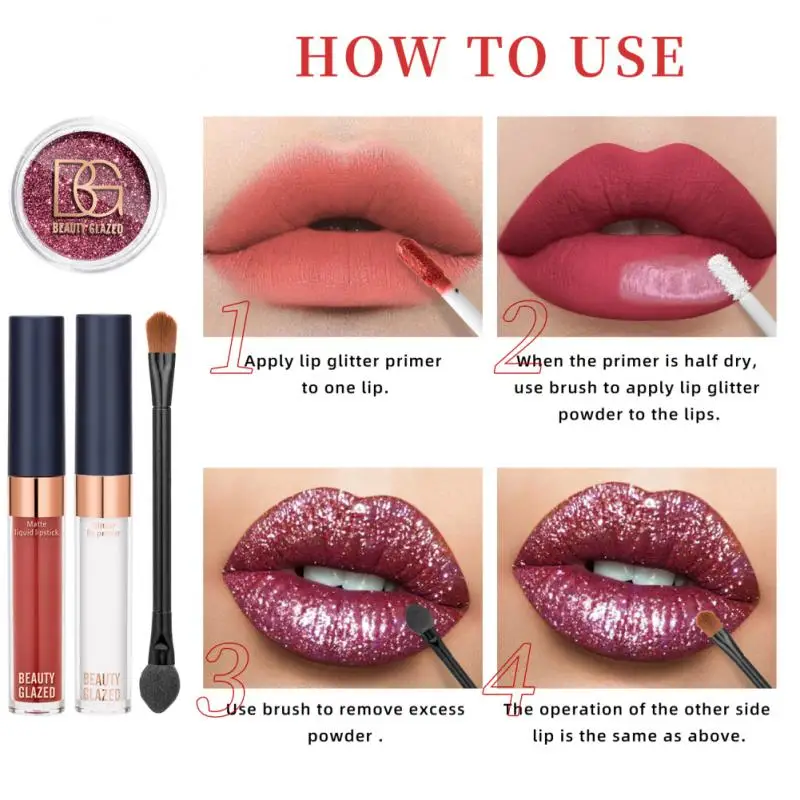 How to Use: First apply lip gloss primer on the lips. When the primer is half dry, apply lip gloss glitter on the lips with a brush, and remove excess powder with a brush.