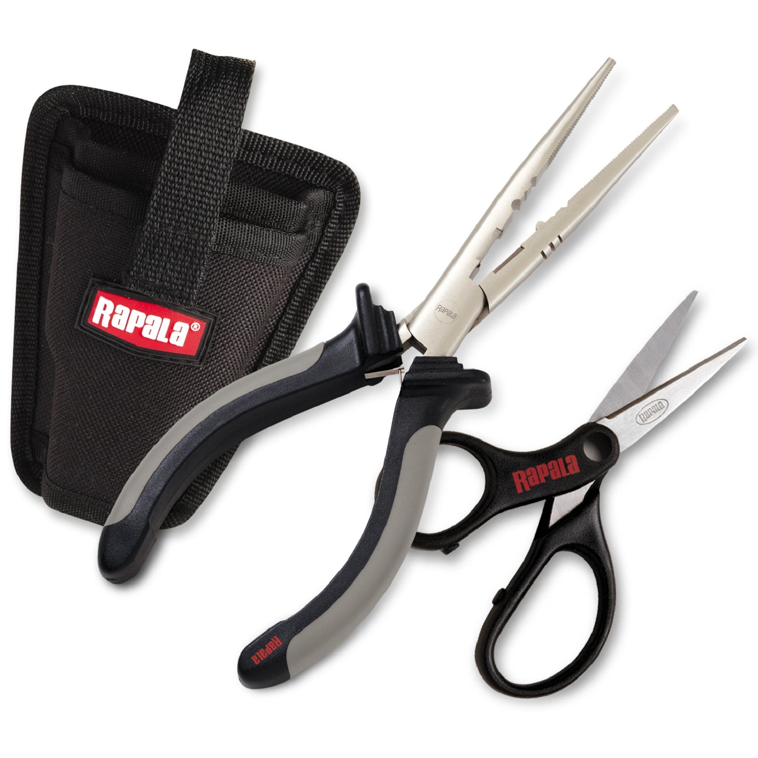 Keeps your tools right where you need them most. The Rapala Pedestal Sheath holds both pliers and scissors securely with a Velcro strap and fits most boat seat pedestals. The 6.5" fisherman's pliers is constructed of carbon steel, having a split ring crimper, and side cutter for line/leaders. The Super line scissors have a serrated cutting edge designed to grip and hold tough braided line for easy, non-slip cutting.