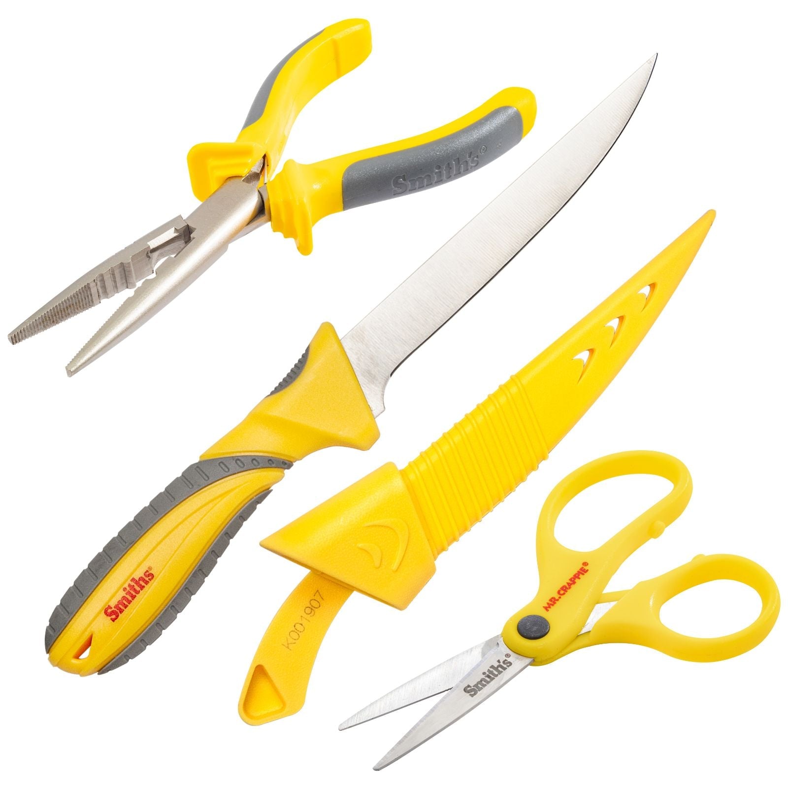 The Smith's Mr. Crappie Combo kit includes the Slab-Sticker 6 in fillet knife with sheath, the Mr. Crappie 3 in Poly and Braid line scissors, and the Mr. Crappie 6.5 in pliers. This is a must have for your tacklebox!